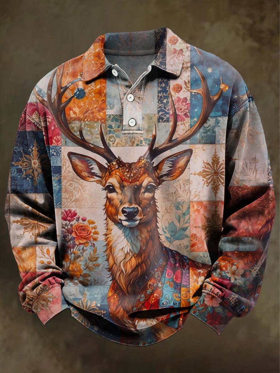 Polo Décontracté Renne de Noël Imprimé à Manches Longues